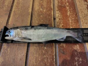 ヒメマスは今日も好調でした。ヒメマス専門で釣行された方は20~30匹(制限匹)の釣果で、棚は深め(30m前後)が良かったそうです。