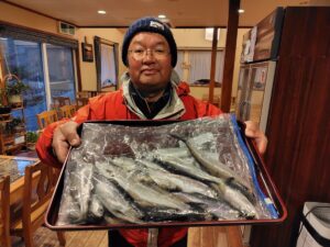 ワカサギは今日も深棚が良く、最高12時半上がりで300匹(棚25m底)でした。午後から釣行されたお客さんも短時間でも釣れました。