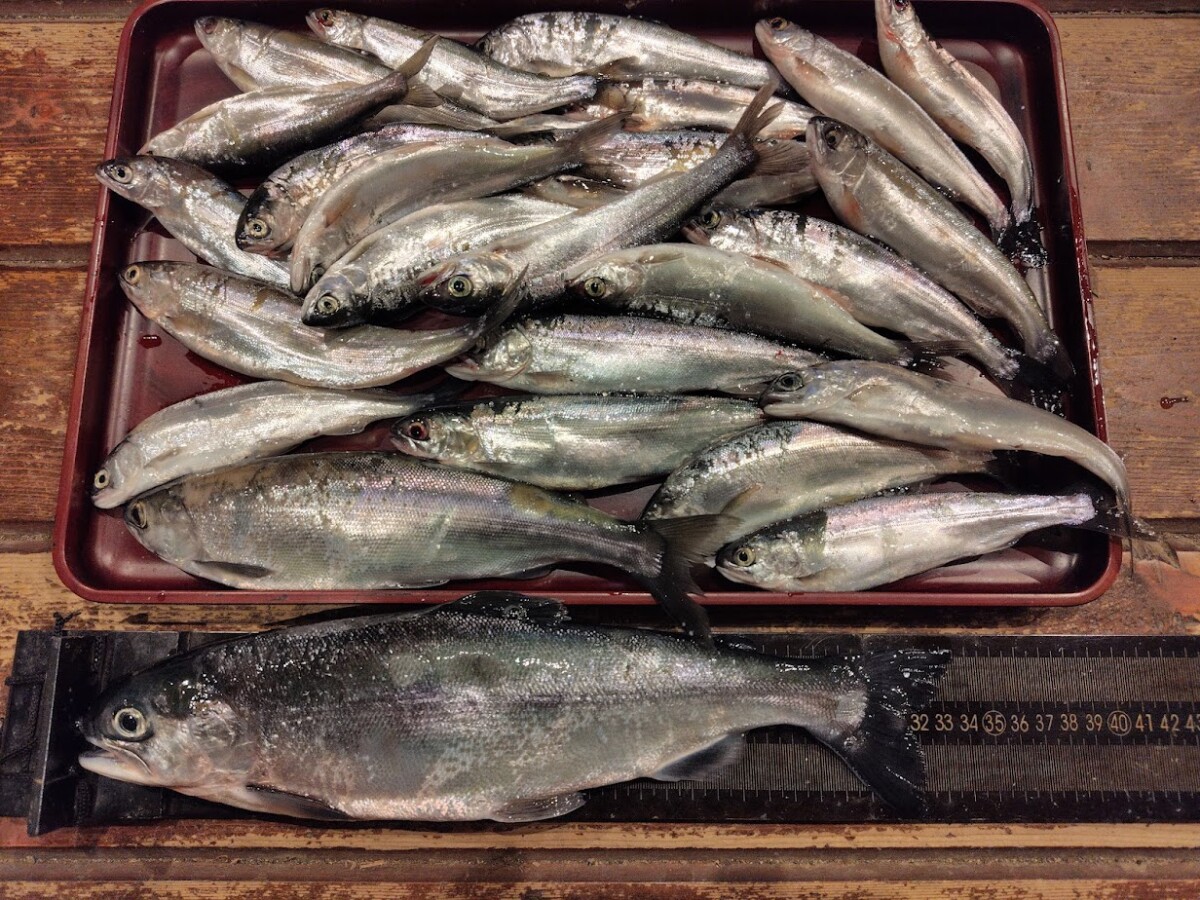 ヒメマスは0~25匹の釣果で、ブイ釣りではほとんどアタリも無く・・・トローリングの方が25匹(最大33cm)でした。